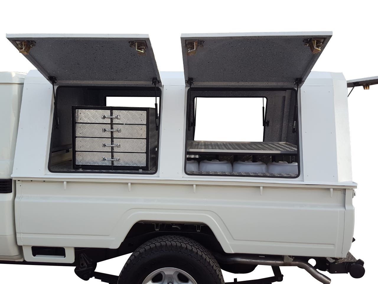 Delta V's range of Aluminum canopies are suited for a range of industries, from service orientated tradesmen to on site technicians. Our range of interior draw sets and false floors - allow for the Maximum use of the interior space. Use one of our standard systems or contact us to customize a system for your specific requirements.